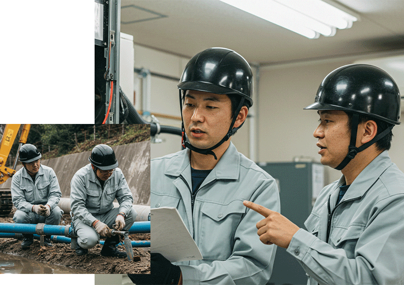 人々の快適な暮らしと持続可能な社会基盤を支えるため、空調換気衛生設備工事と上下水道工事を融合した多角的なアプローチで、高品質なインフラサービスを提供しています。